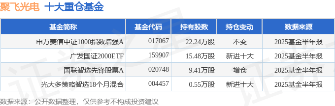 持有聚飞光电最多的基金为申万菱信中证1000指数增强A,目前规模为0.87亿元,最新净值1.231(8月22日),较上一交易日上涨1.3%,近一年上涨67.46%。该基金现任基金经理为刘敦夏祥全。